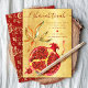 ”L'Shanah Tovah.” Ta emot Rosh Hashanah-firandet med det här stilrena och eleganta nyårskortet. En konstnärlig och grafisk röd, guldfläckig akvarellgranatäppel, mörkröd handskriven typsnitt och en mörkröd David-stjärna ligger över en texturerad, falsk guldmetallfolie-bakgrund. Ett falskt guldmetallfolie-mönster med botaniska blad pryder baksidan mot en djupt mörkröd bakgrund. Känn värmen och glädjen under högtiden när du skickar det här moderna, fantastiska och stilrena gratulationskortet. Skicka det till någon speciell! Skriv bara in hälsningen och namnet du vill använda så kan du enkelt anpassa det här julkortet. Meddela mig om du har några frågor