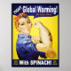 Den humoristiska Rosie-poster Riveter-spoof, en stor förväpnad, ansjovis-tattoed Rosie som förespråkar mot global uppvärmning genom att gå Vegan och äta spenat. Poster, t-shirts, kort, presenter.