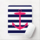 Ett ljust, rosa silhouette för neon av en ankra är på en marinblå och vit görad randig bakgrund. En roligt, nautisk design.