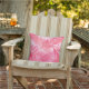 Dekorativ kudde i ett tryck av överlappande handflatanlövsilhouettes, skuggar in av djupa korallrosor och persika, mot en pastellfärgad snäckarosabakgrund