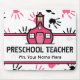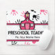En förskole- läraremousepad som presenterar en bakgrund av rosa och svart handprints över vit. Den rosa Schoolhouselogotypen på centrerar. Text läser "den FÖRSKOLE- LÄRARE.", Personifiera med ditt namn. Sök efter att matcha objekt på den rosa schoolhousen.