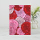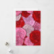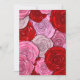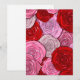 En frodigt detaljerad illustration av lager på lager av fullt utslagna rosor i rött, rosa och lavendel.
