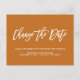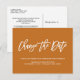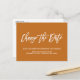Behöver du skjuta upp eller boka om din bröllopsdag? Varna dina gäster om att bröllopsdatum har ändrats med detta Eleganta bröllopsförsening eller datumändringsmeddelande med en trendig scriptbokstav som säger "Ändra datum" i vitt över en modern rostbakgrund.