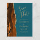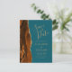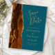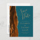 Denna eleganta moderna postkort för att spara datumet har en bränd orange och rost vattenfärg agat kant med falskt guld glitter. Anpassa enkelt den guldfärgade texten på en tealblå bakgrund. På baksidan kan du redigera den anpassningsbara returadressen och ange din bröllopswebbadress för att generera en QR-kod som dina gäster kan skanna för att lära sig mer om ditt kommande evenemang.