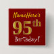 Detta enkelt kvadrerar knäppas designsärdrag en meddelandenågot liknande"NameHeres 95th födelsedag! " med "95th" ha en look för faux-/efterföljdguld-något liknande färgläggning, på en röd kulör bakgrund. Namn kan vara personligen. Knäppas något liknande som dessa kunde kanske ha på sig av gäster på en födelsedagsfest för någon, som firar deras femte födelsedag för nittio, var partyet rymms i ett stort område med raddor annat folk gåva (liksom en stad, parkera eller ett nöjesfält). [~Z0000163]