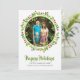 Snyggtens vita anpassningsbar, ett platt kort för julfoto med stil, med grafik av en grönt halvhjärtad krans med röda bär och anpassningsbarnas fotoplats inuti. Anpassa anpassningsbarna och bild till kostym som helgdag behöver.