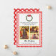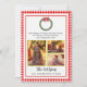 Det här klassiska julkortet har en rödfärgad pläterad gräns med en vattenfärgad krans med rött båge. Anpassa med egna foton från namn och familj. Läser "Bra tidningar vi tar med oss till dig och din anhöriga. Vi önskar er God jul och Gott nytt år!"