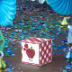 Rött äpple "Tack för att du kom", ett tema för babyduschning på äppelodlingen.