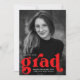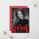 Snyggt tillkännagivande för studenten med student lodrät-fotot med "grad" med fet röd text. Anpassa fotot studenten genom att lägga till student namn, studenten och skola. Tillkännagivandet går tillbaka till visningen ett rött och vitt reflektorbåge mönster.