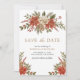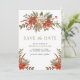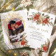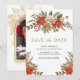 Överraska dina gäster med det här eleganta "Spara datumet"-kortet med vackra röda julstjärnor och rustika tallbarr.