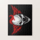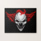 En lycklig ond clown med ljust rött hår och en svart näsa.
