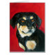 Pet porträtt av en hund mot en röd bakgrund. Målning som återges i akryl.