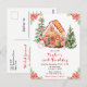 Denna eleganta och festliga födelsedagsinbjudan har ett akvarellhus av pepparkakor och vackra röda julstjärnor. Texten kombinerar handskriven skrift och typsnitt utan seriffer för en stilren och modern look. Snömannen, dekorerade tallar och julkransar lägger till en festlig touch. Detta är perfekt för jul födelsedagsfester.