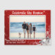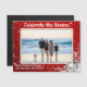 Röda julkort med en enda fotomall och magnetbaksida. Väntande stjärnor, prydnadsföremål och blommor från träd utgör ram för ditt foto. "Fira säsongen" är ett stickprov från hälsning. Inkludera familjen namn eller namn vid grund.