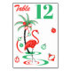 En roligt-, fetiv-, flamingodesign med en återtryck i rött och grönt. En röd flamingovågor i vatten intill handflatan träd, dekorerad med julbalkar och band. Ett anpassade som du kan anpassa med egen text, bilder och egna idéer. En originalbild för digital konst skapat av Jess Perry.