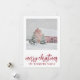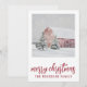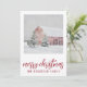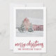 Enkel röd lada i vintersnö semester julkort. Lägg till ditt familjenamn. Landsbygd stil.