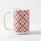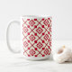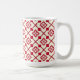 Elegant sömlöst mönster med röda blomster motiv infattade av kraftiga geometriska galler, presenterade på en vit bakgrund. Perfekt för textilier, heminredning eller grafiska designprojekt som kräver en sofistikerad touch.
