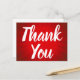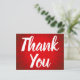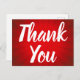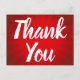 Ett vykort med Tack med vit penseltext och röd solnedbrytning.