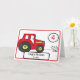 4e födelsedagen-kort med röd traktor och hund. Detta illustrerade kort är perfekt för föräldrar eller mor- och farföräldrar till en son/sonson när han fyller fyra år. Kortet lyder "Grattis på födelsedagen" på utsidan och rymmer utrymme för pojkens ålder och namn. Det inre meddelandet kan också vara personlig.