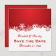 Vit vinterbröllop Spara datum meddelande med snöflingor, med vit gräns snöflingor på ljusröd bakgrund. Ett val av perfekt för Winter December bröllop.