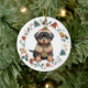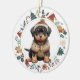 Den här söta Helgdag har en vattenfärgsbild av en adlig Rottweiler-marionett som är klädd i hans vinterskidsötare och hatt. Bilden är inramad i en färglös krans som består av olika Helgdag, inklusive snögubbe, klockor, candy cane, strumpor, holly och mycket mer! Baksidan av dekoratet har samma utandningsbild med anpassningsbarna i grönt, guld och rött.