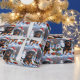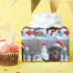 Rottweiler springer i snö med julhatt presentpapper