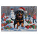 En mäktig Rottweiler springa glatt över snövinteckan, med en frisk röd julhatt. Denna djärva utformning belyser rasens starka byggande, lojala och självsäkra karaktär samtidigt som den tar upp julhelgens värme och glädje. En slående vinter-fullt av festlig cheer.