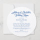 Menymall för rundbröllopsmottagning. Det är enkelt att anpassa marin blå text i två ställen. Fet blå text överst för titeln som innehåller namn för bruden och brudgummen/paret. Den blå texten för måltider är skriven som stycke. Använda brev och blanksteg som behövs för att texten ska passa in. Provexemplaret visas på solkraftens pappra med annan tillgänglig papper.