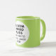 Round LIME GREEN siongle image frame custom Combo Mug for photo or logo, 11 oz., 3.2" diameter x 3.8" high, with LIME GREEN background single image frame (one central customizable design area) providing maximum coverage of the mug in LIME GREEN. See store for more templated font options. The background color has been chosen to closely resemble the combo mug inside and handle color but may not match exactly, due to the difference between printing and enamel tones.