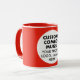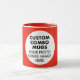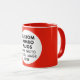 Round RED siongle image frame custom Combo Mug for photo or logo, 11 oz., 3.2" diameter x 3.8" high, with RED background single image frame (one central customizable design area) providing maximum coverage of the mug in RED. See store for more templated font options. The background color has been chosen to closely resemble the combo mug inside and handle color but may not match exactly, due to the difference between printing and enamel tones.