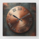 round copper plate, weathered metal design, copper patina, vintage look, industrial style, roman numerals, wall clock