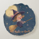 Ta in Halloween magin i ditt rum med den här rundkudden med en leende liten häxa som rider hennes pjäs över natten himmel. Med det redigerbara textalternativet kan du lägga till ett namn eller ett meddelande, skapar det en roligt och en unik personlig Halloween-gåva eller säsong-hemaccent.
