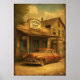 Detta konstverk frammanar anden av den klassiska Route 66, med en vintage amerikansk bil parkerad utanför en nostalgisk vägkrog i Chicago. Inspirerad av amerikansk kultur från mitten av 1900-talet och retro-resklipor, fångar den romantiken med öppna vägar, tidlösa bilar och den gyllene eran av amerikanska roadtrips.