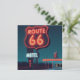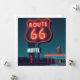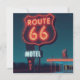 This vibrant digital illustration captures a classic Route 66 scene at night. A glowing neon Route 66 shield and bright motel sign stand out against a deep blue sky, with silhouetted hills and a lit road adding depth. Retro colors and geometric shapes evoke vintage Americana and nighttime road trip nostalgia. Perfect for fans of travel, neon art, and iconic American highways.