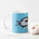 Snygg keramisk mugg, med grafisk konst av en vit haj fångad i en vattenflaska, mot en blå virvlande våg bakgrund. Anpassa för att lägga till din egen text.