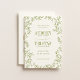 ROWAN Botanical Greenery. Wedding save the date photo card. Features, citrus moss green typography, botanical line art sketch illustration frame and single photo on back.