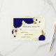 Det fina anpassadet botaniska OSA kort royal blåa blommor med guld löv mot elegant marmor Bakgrund Uppgifterna i glitter simuleras.