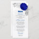 Romantiskt royal blå och vita blommor med silver löv botaniskt bröllop-menykort. Uppgifterna om glitter simuleras.