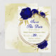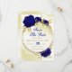 Vackert spara datumkortet med Royal blåa blommor och guld löv på ett elegant guld geometriskt ram. Uppgifterna om guld glitter simuleras. MER MATCHING PRODUCTS FINNS i samlingen ovan eller kontakta mig