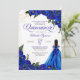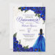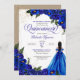 Quinceanera-inbjudan i royal blue ro med accents från guld och en tjej med elegant boll-gäss. Sök efter den här inbjudan hos flickor i olika hårtoner och färg.