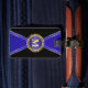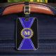 Den här eleganten har ett geometriskt band av royal blå och guld med en vacker monogrammedaljon. Det är en utmärkande gåva till den som ofta reser. Redigera monogrammet och kontaktinformationen genom att ersätta exempeltexten som visas i designmallen.