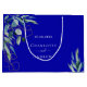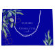 Royalets blå bakgrund. Dekorerad med vattenfärgade eukalyptus greenery och guldblad. Anpassa och lägg till ett datum och namn i brudgummen. Vit text. Perfekt för presentemballering eller för tjänster.