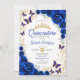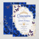 Royal blue, gold and white Quinceanera celebration invitation. Features, script font, gold butterflies, watercolor roses and tiara. Perfect for an elegant princess style glam celebration. Personalize with your own details. Printed Zazzle invitations or instant download digital printable template.