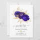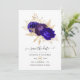Blått kort för royal och lila blommigt bröllop spara datum med accenter för guld anpassade till dina händelsespecifikationer.