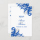 © 2012 Socialite Design. Vackra hörnsnurrar och flourerar bröllop-svarskort med royal blue och silver-grått färg.