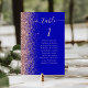 Det moderna kortet för bordsnummer i bröllop som är lämnat kant i eleganten har ett faux glitter guld i ro. Ord "bord" visas i ro rosa visstiskt handskriftsskript på royalets blå bakgrund. Lägg till namnen för de gäster som tilldelats varje bord.