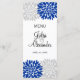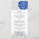 © 2013 Socialite Design. Vårt menykort för elegant personlig bröllop har blommor av royal blå och silver-grått färg på framsidan och baksidan. På framsidan finns parets datum namn och bröllop. Baksidan innehåller menyalternativen. Kontakta Socialite Designer om du behöver hjälp med att anpassa det här menykortet för evenemanget.