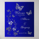 Det här royalet blått, marinblått och silver grått-poster har simulerat präglat utseende av silver metalliska GLOOK-fjärilar, blommor och viner på den som matchar den bröllopsinbjudning som visas nedan. Anpassa texten till namn på bruden och brudgummen, tillsammans med bröllop-datumet. Om du behöver hjälp kan du skicka e-post till niteowlstudio@gmail.com.