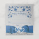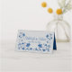 Det romantiska royalet blue och silver grått-blommigten som är uppfällt i bröllop har en bild av ett par gått med hjärtan ovanför ett royal blått band och en bågbild som löper tvärs över framsidan av platskortet. Det finns en simulerad silver gräns under menyfliksområdet och royalets blå text på en grått-bakgrund. Namnen på bruden och brudgummen, tillsammans med bröllop-datumet, trycks på baksidan av det vikta platskortet i royal blå med blåa blommor som omger texten.
