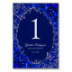 Royal blue silver Quinceanera celebration table number cards. Features, script font, glitter silver butterflies, watercolor roses and tiara. Perfect for an elegant princess style glam celebration. Personalize with your own details. Printed Zazzle invitations or instant download digital printable template.